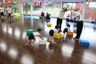 あんよさん、やんちゃさんの登った山とは違い、わんぱくさんは、斜面を手を使わずに登ります!ゲームボックス1段(45㎝)の坂なんて問題ではありません!2段(90㎝)の坂になると手を使いながらもしっかりと足の裏で蹴り、登ります!2段では、坂道だけではなく、ハシゴ登りもあります!登った後は、ジャンプ!高い所に登ることやジャンプすることが好きな子ども達ですので、かっこよくジャンプし、ポーズも決めていました!