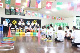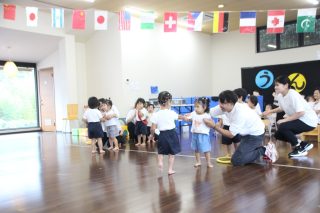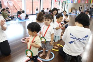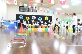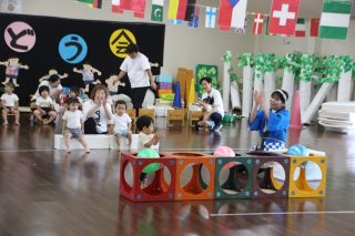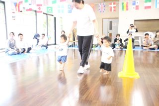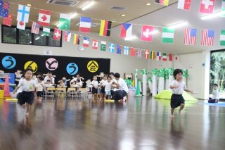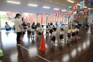 園長先生が転がすリングとボールを子ども達が追いかけます!ボールやリングを追いかけることに夢中になり、みんな全力疾走!体が温まったところで、やんちゃ組・わんぱく組混合リレーです!《みんなは一人の為に、一人はみんなの為に》チームの為に一生懸命走ります!1歳児・2歳児という小さい年齢でありながらも、とても白熱したリレーでした!保護者の方の応援にも力が入ります!
