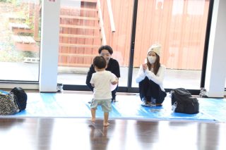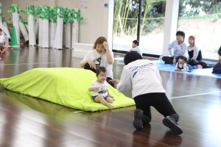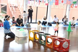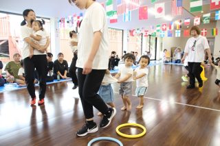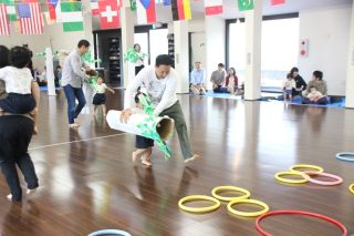 会場に、子ども達と保護者の方が集まり、列車ごっこでウォーミングアップが始まります!音楽に合わせて荷物を上手に運びます!
