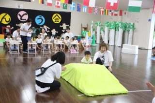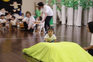 あんよさんは、マットの山を登り、お母さんと巡り会える予定でしたが…なんと、あんよさんは、朝からお母さんと離れても泣くことがなく、とても落ち着いていた為、”お家の方と離れていても出来る!”という姿を見てもらおう!と急遽、内容を変更!園長先生がみんなのお母さん替わりになりました!園長先生が呼んでもしっかりと園長先生の元まで来るあんよさんの子ども達です♬やんちゃさんは、園長先生が大好きなので、山を越えて一目散に園長先生の元へ駆けつけていました!山の乗り越え方は、あんよさんはハイハイ、やんちゃさんは立ったままと発達、成長の差を感じられたのではないでしょうか。