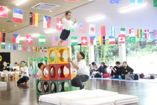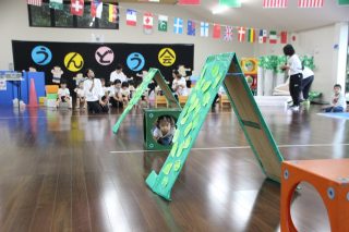 1段、2段とジャンプを乗り越えてきたわんぱくさんですが、次に挑戦するのは、”3段ジャンプ(135㎝)”です!みんなよりも圧倒的に高い所からのジャンプです!練習を始めた頃は、怖くてなかなかジャンプ出来なかった子も練習をしていく内に、怖さを克服し、ジャンプのコツも掴んできました。そして、当日も一本橋を軽快に渡り、ゲームボックスをよじ登り、躊躇うことなくジャンプ!お客さんを魅了させていました!