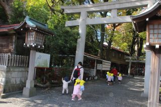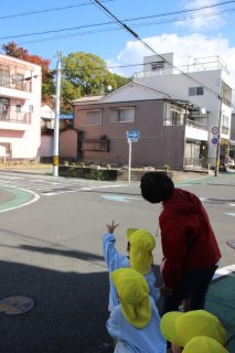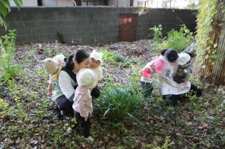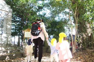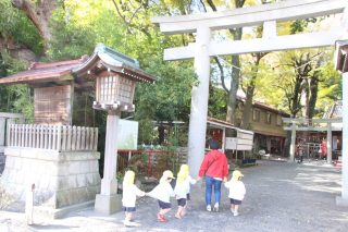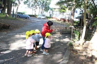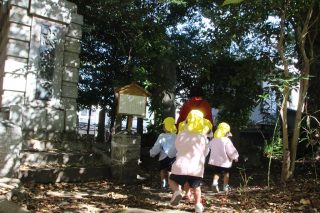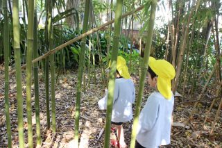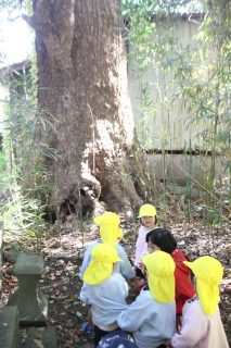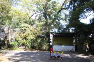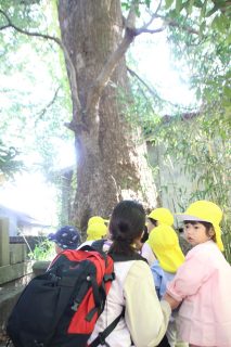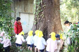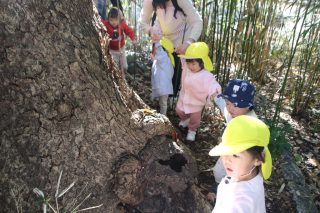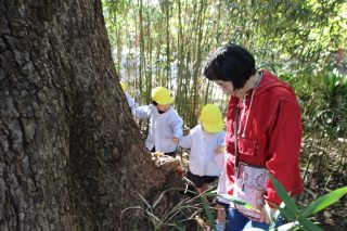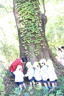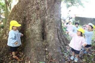今週に入ってから子ども達には、「森」に関するお話や絵本をたくさん読んできました。前日には、「古い大きなおじいさんの木を探しに行こう!」と全クラスで保育園の近くにある、”小芝神社”へ行きました。大きな木が見えてくると「あったー!」と大きな声で子ども達が教えてくれ、神社の中でも一番大きな木を探し、その木の周りをみんなで手を繋いで大きさを調べたり、木に隠れてかくれんぼをして「森」のイメージを深めてきました。