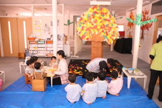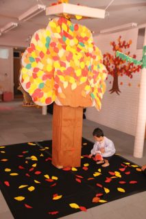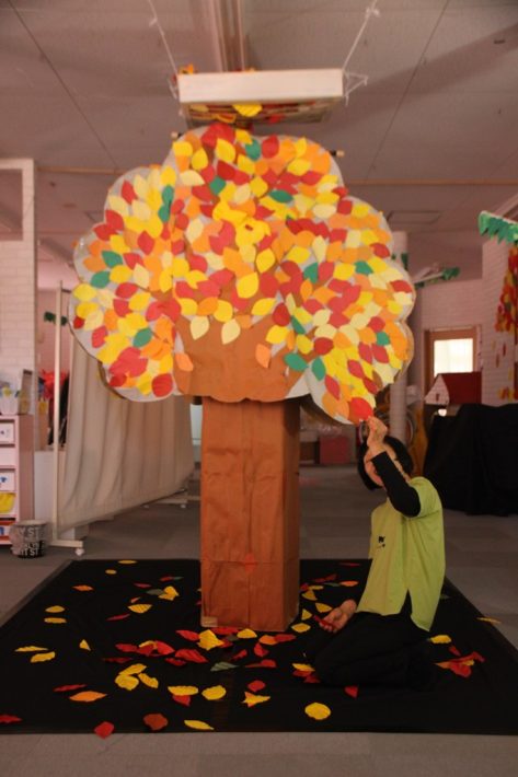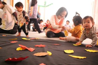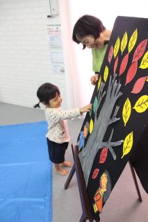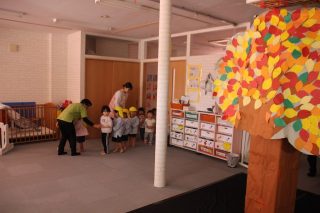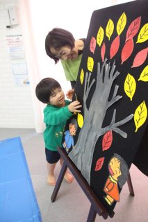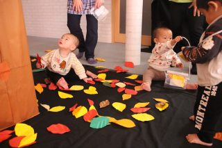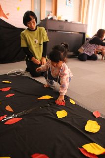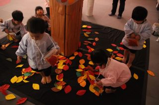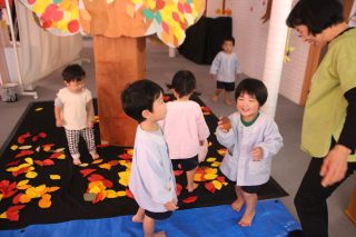 当日は、パネルシアターを見て、園長先生が「みんなもおじいさんのいるふしぎな森へ行ってみよう!」と誘うと、子ども達も「行くー!」と張り切っていました。扉を開けると…そこは空気が冷たく、いつもの保育室とは違った雰囲気の場所でした。そこには、大きな一本の木が立っています。子ども達も神妙な表情に変わり、気をじっと見ていました。「おじいさんの木があったね!こんもおじいさんの木と一緒に遊ぼう!」ということで、ごっこ遊びが始まりました。風が吹くと空から葉っぱが降ってきます。子ども達も空を見上げ、葉っぱが舞う様子を見て楽しんだり、かくれんぼや木の実探しをしました。まるで子ども達が絵本の主人公となり、絵本の世界で遊んでいるような活動となりました。